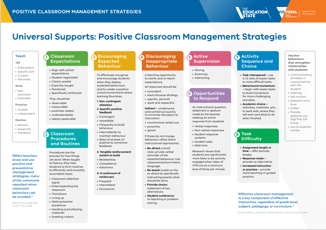 Across the school, staff consistently use Positive Classroom Management Strategies, supported by the Department’s PCMS Placemat and Getting Started Guide. These strategies include: